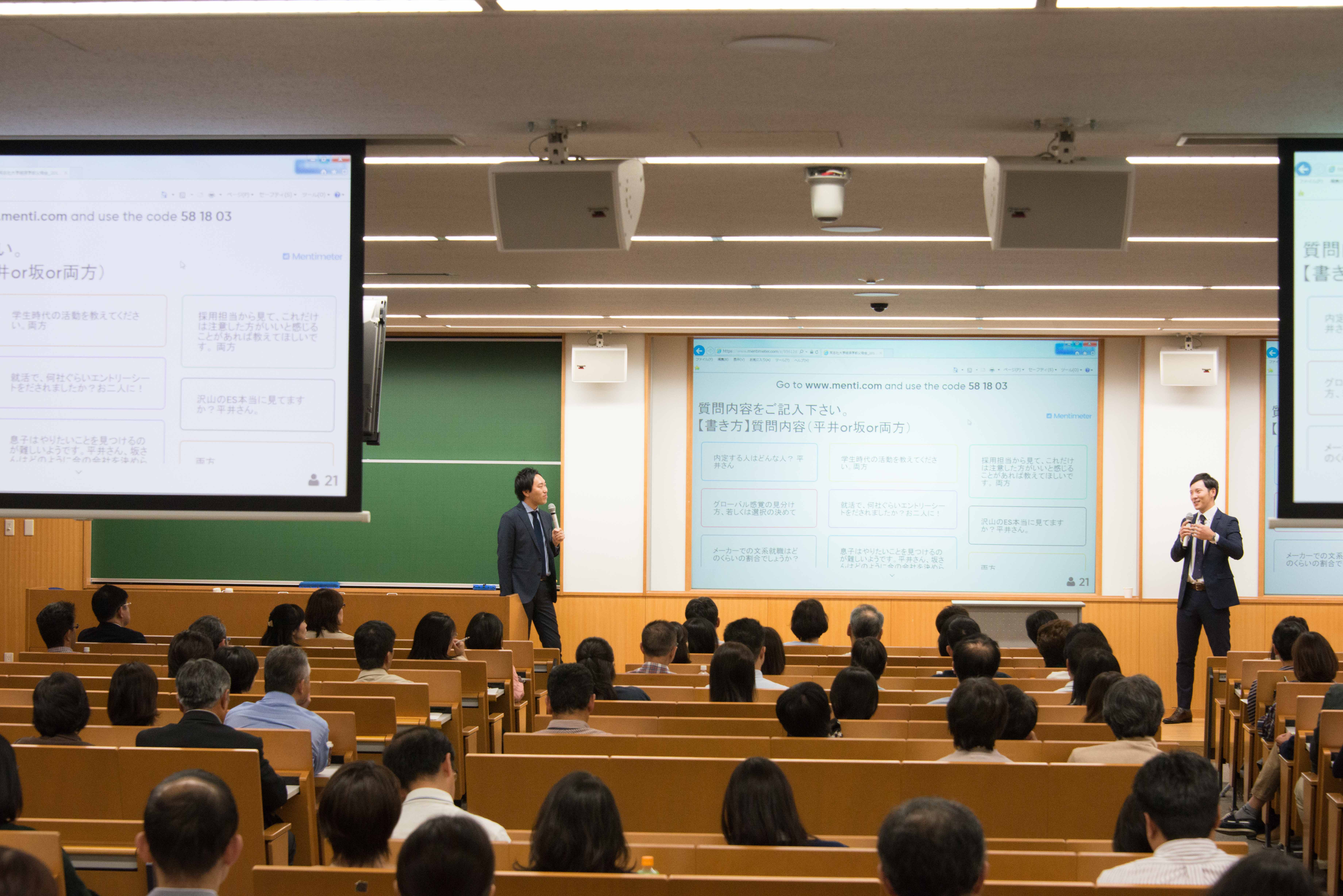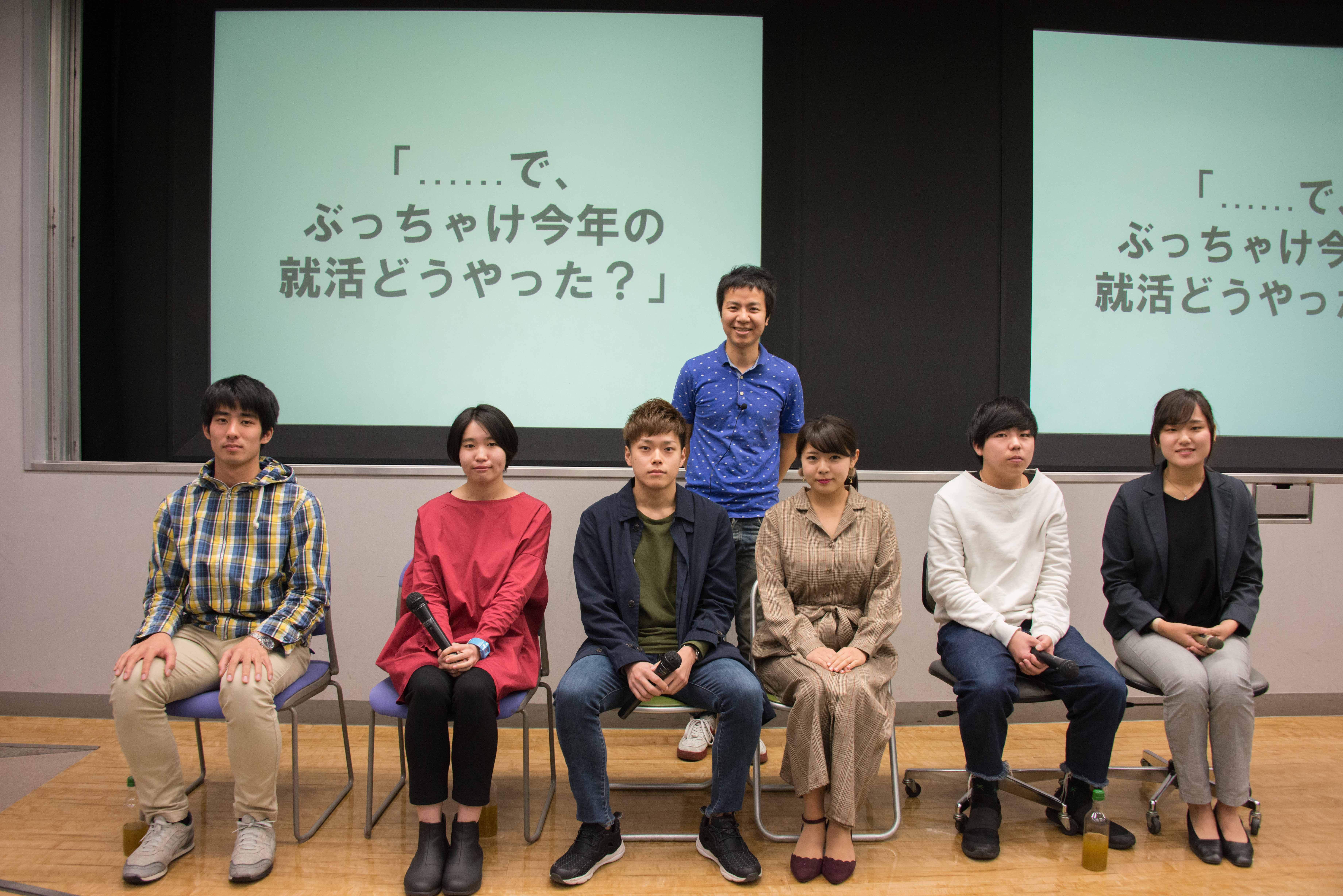 続いて、秋山氏にMCを務めていただき、横井教授のゼミ生4名と関西学院大学、立命館大学の学生各1名を加えて就活の体験談を語ってもらうコーナーが登場。たくさんの保護者を前にして多少緊張もあったとは思いますが、秋山氏のマシンガントークに緊張も解れたのか、ある程度就活生の本音が聞けたような気がします。
