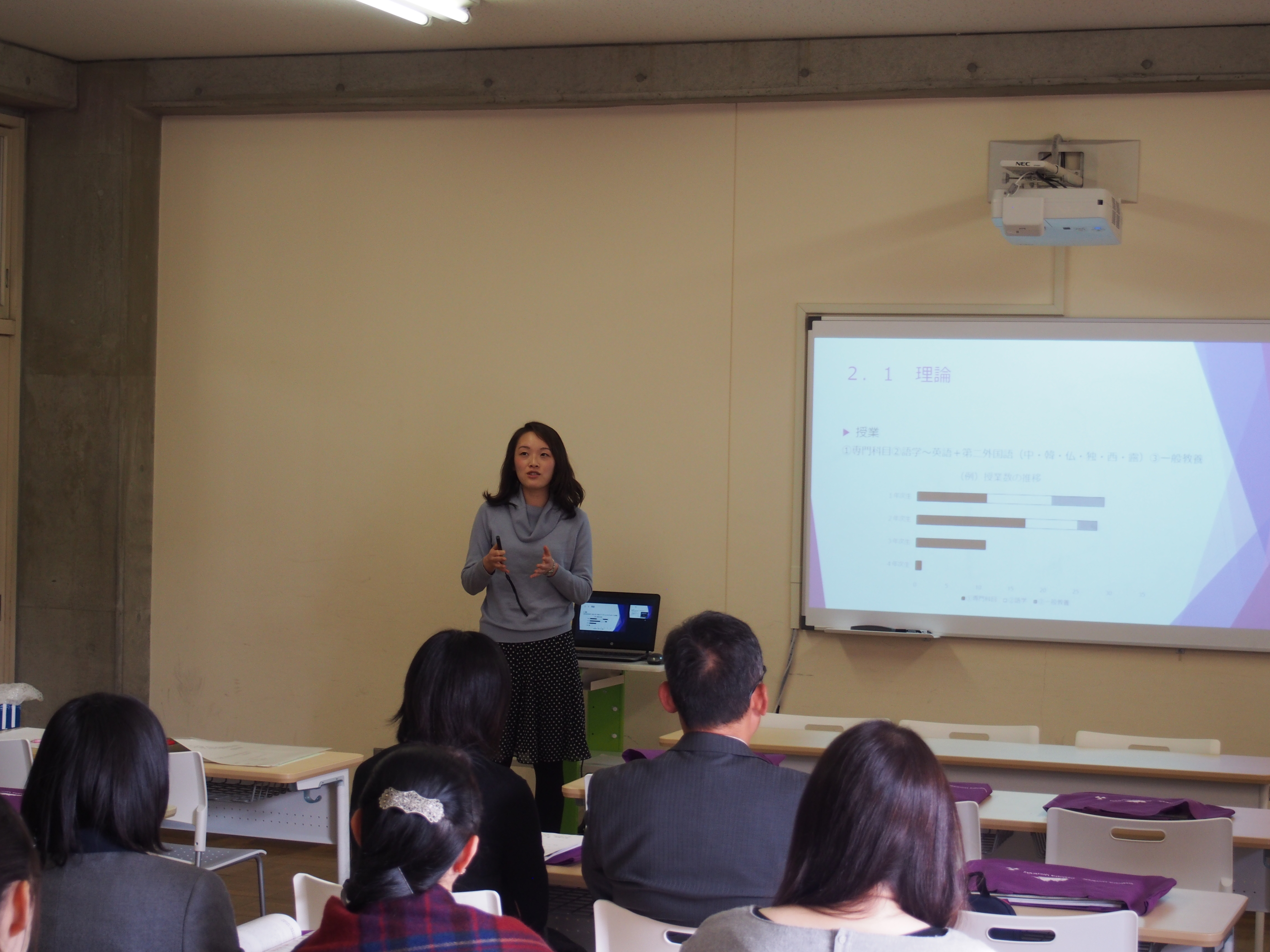 授業は1年次では大規模な授業が多い中、語学は少人数で学べます。