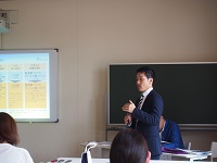 1年次~4年次にかけての経済学部のカリキュラム概要を、ご自身の授業風景のスライドなどを使って学生生活の様子を説明していただきました。