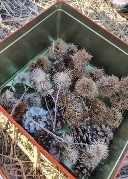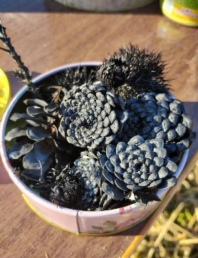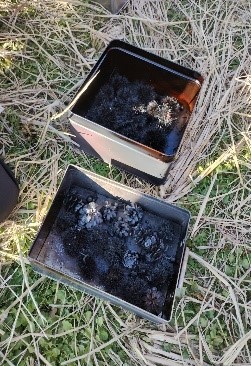 山で採れた松ぼっくりなどを缶に入れて20分ほど熱して炭に。消臭剤になるということで、ご父母の皆さん瓶や缶に入れてお土産にされていました。