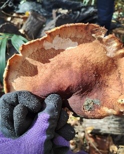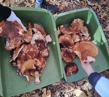 岸准教授から、里山についてのお話を聞きながらシイタケ狩りへ。手の平より大きいシイタケに大興奮。