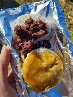 小豆も里山で育てたもので、ゼミ生の自家製餡。採れたてのシイタケ入りお味噌汁や猟銃会の方が仕留めたイノシシ肉まで。おなか一杯いただきました。