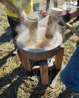 昼食は、里山で採れた緑米という、古代米のうるち米で餅つき。