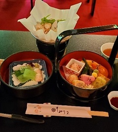 入口の専用のつり橋を渡ったところに川床席があり、清滝川のせせらぎを聞き、新緑に囲まれた綺麗な景色を愛でながら美味しい京料理に舌鼓を打ちました。