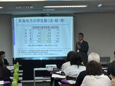 そして最後に経済学部教授 谷村智輝先生より、「学生生活について」というテーマでご講演をいただきました。経済学部の学生は全国から入学しており、2024年度の下宿生の割合は学部全体の48.2%を占めています。また特に中部地方からの学生は多く在籍しています。学生生活に関する調査結果や経済学部での生活等については、下記のとおりとなります。